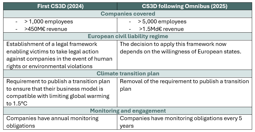 Adopted in 2024, the CS3D originally required companies to identify, prevent, and mitigate ESG-related risks within their operations. The CS3D has also been significantly weakened and reshaped by the Omnibus package: