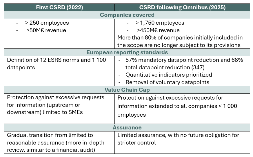 The Corporate Sustainability Reporting Directive (CSRD) is one of the key components of the European Green Deal. Its purpose is to enhance transparency regarding companies’ ESG impacts across their entire value chain. While its application began for the 2024 financial year, the adoption of the Omnibus legislative package introduces significant changes. The main adjustments concern the scope of companies covered, the level of reporting, and modalities of verification: