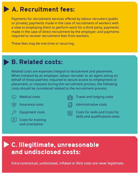 Les frais de recrutement créent un endettement immédiat pour les travailleurs migrants qui empruntent souvent à des taux d’intérêt exorbitants pour obtenir un emploi à l’étranger. Cette dette transforme l’emploi en servitude, les travailleurs ne pouvant quitter des conditions d’exploitation avant le remboursement. Ce déséquilibre de pouvoir facilite de nombreux abus, notamment des heures de travail excessives, des salaires retenus et des conditions dangereuses—tandis que les travailleurs craignent que signaler ces violations entraîne la perte d’emploi ou l’expulsion. L’OIT a ainsi pu identifier les différents postes de coûts cachés suivants (en anglais) :